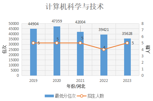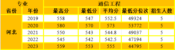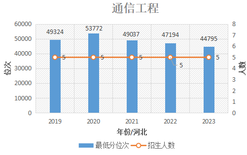 以上是河北省近5年来的生源质量统计分析,数据表明:2019-2023年最低分和最高分都有一定起伏,在合理范围区间,2021年相较于2020年下降偏高,但从招生位次看,四个专业近5年来均呈上升趋势,说明3377体育 各专业在河北省的热度和认可度有一定提升。