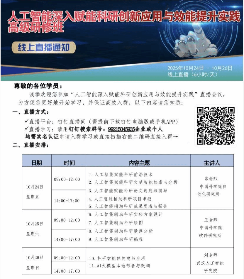 软件研究所王老师,武汉人工智能研究院刘老师主讲。系统阐述了AI技术如何从辅助工具演变为驱动科学发现的“核心引擎”,并通过大量生动案例,展示了其在变革科研范式、提升科研效能方面的巨大潜力。