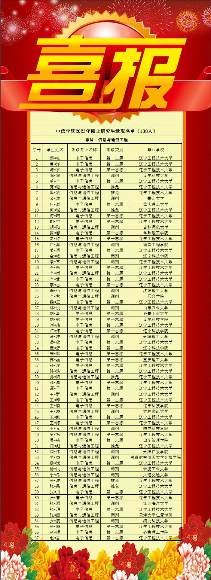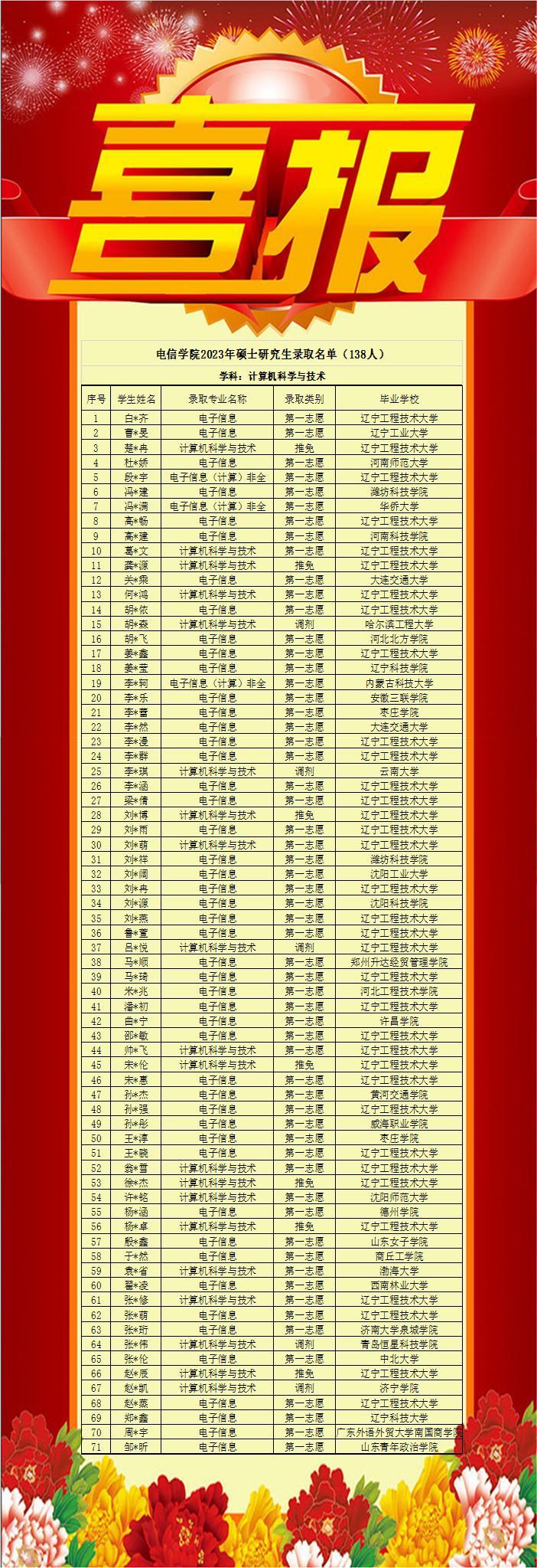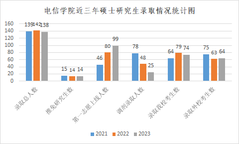 本年度硕士研究生招生共录取138人,其中第一志愿录取113人(推免14人,第一志愿考取99人),调剂录取25人,分别占比82%和18%。录取学硕50人,专硕88人;全日制135人,非全日制3人;通信学科67人,计算机学科71人;本校考生74人,外校考生64人。调剂录取一次完成。300分以上95人,其中通信学科41人,计算机学科54人,占所有录取考试比例为76.6%(总人数124不包含推免)。