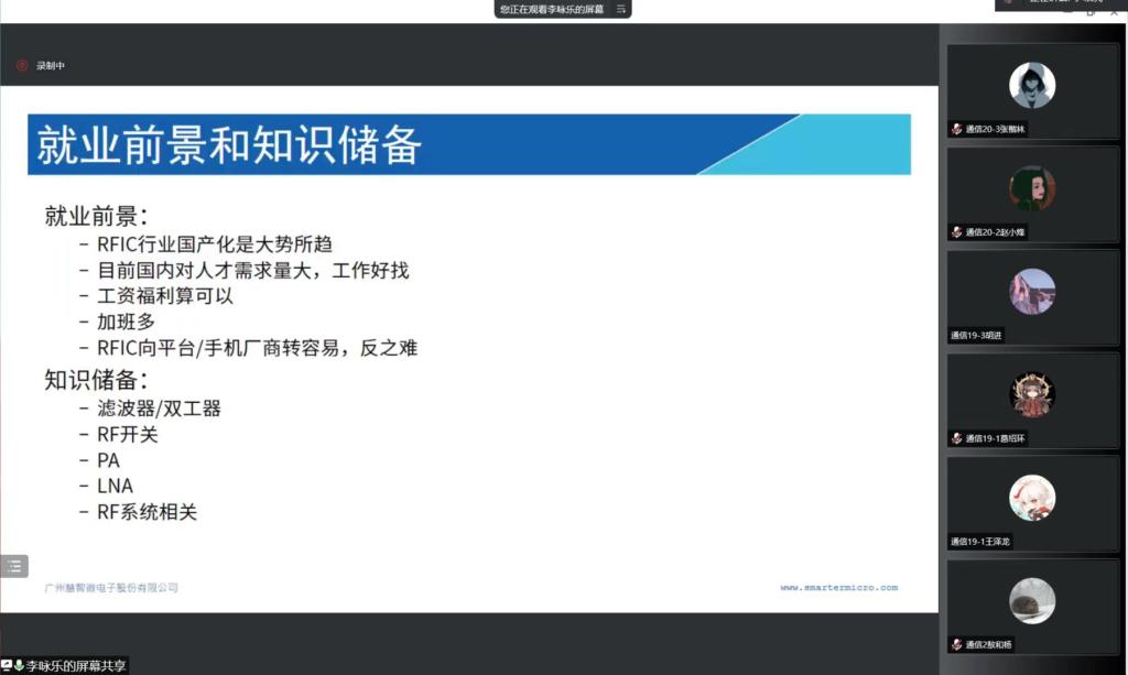 通信工程系策划组织的“2022优秀校友系列报告会”第二场如期进行。本次报告会由通信工程系优秀校友李咏乐主讲,杨顺副教授主持,主题为“移动终端RFIC器件研发简介”。通信工程2019级、2020级全体学生及相关老师通过腾讯会议在线参加了此次报告。