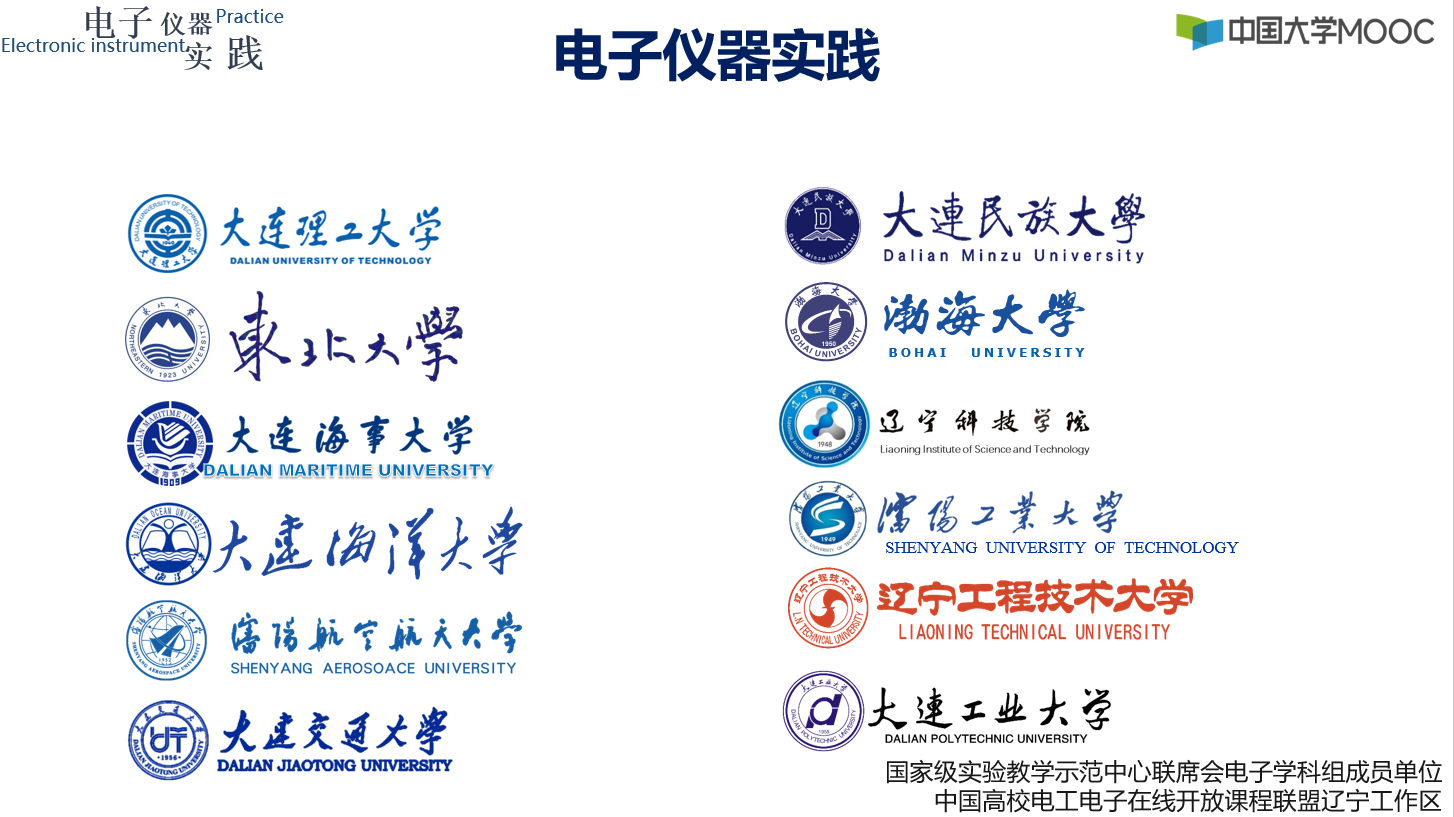 该课程由电工电子在线开放课程联盟辽宁工作区负责建设,依托国家级实验教学示范中心电子组联席会成员单位共同建设完成,于2018年11月开始筹备,由大连理工大学牵头,辽宁省12所高校中一线的具有丰富实践教学经验的教师共同设计完成,设计制作历经2个余月的课件设计与录制,所有参与教师反复推敲、打磨,每个仪器设备的使用都结合实际电路测试中遇到的具体问题,有侧重点地讲解仪器测试技巧,直观易学,字典模式,使学习者更加容易上手,方便随时查阅。对于线上线下、混合教学和创新实践教学等课程起到辅助作用。