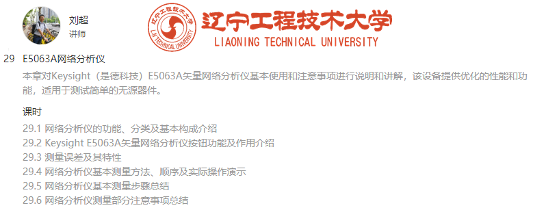 教师刘超参与建设的慕课《电子仪器实践》,在教育部国家级慕课平台“中国大学MOOC”(//www.icourse163.org/course/DLUT-1205724816)上线,第一次开课时间为:2019年04月03日~ 2019年06月24日,通过12周的时间,采用案例式教学,结合实际电路测试遇到的具体问题,有侧重点地讲解仪器测试技巧。刘超老师承担第29学时《E5063A网络分析仪》的课程,对Keysight(是德科技)E5063A矢量网络分析仪使用和注意事项进行讲解,为了保证课程质量,将我校教学及优质仪器质量借助网络平台充分展现出来,参与教师进行了精心准备,课程内容经过了反复的斟酌,其课程设计和内容获得参与同仁们的认可与肯定。本节课程同时由3377体育app官方版