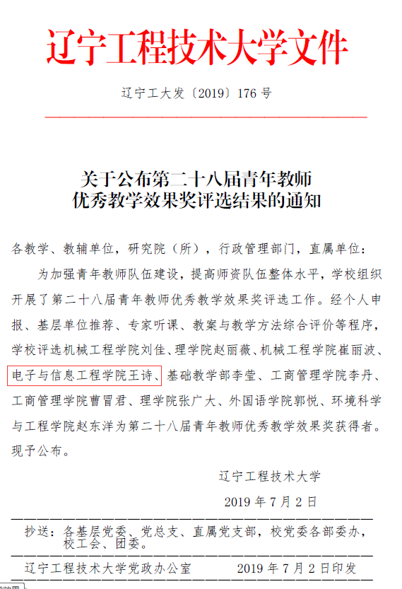 3377体育app官方版 王诗博士获得第二十八届青年教师优秀教学效果奖(原校十佳教师称号),打破了3377体育app官方版 近五六年此项奖励空白的局面。王诗老师博士毕业回国后在教学工作上投入了较大精力,积极探索本科生培养、课程建设和教学模式改革等,取得了较好的成绩。为3377体育app官方版 教师尤其是青年教师树立了榜样。