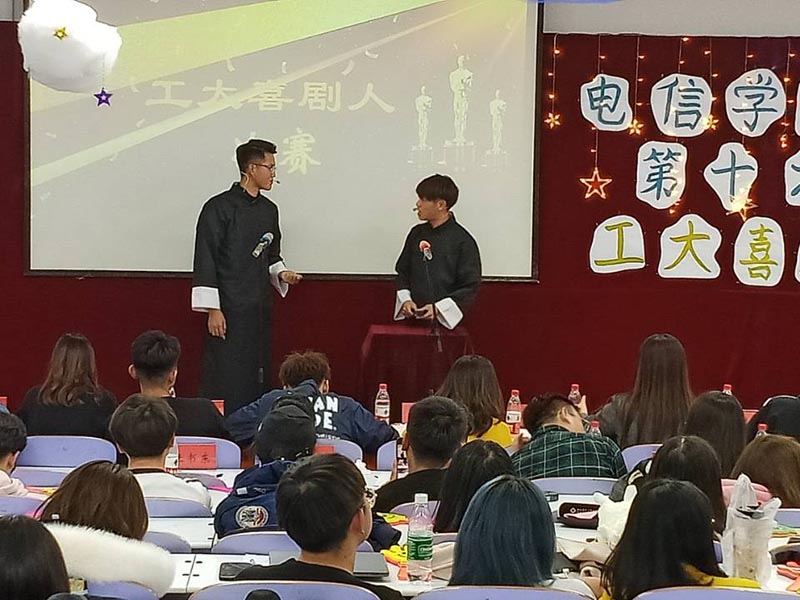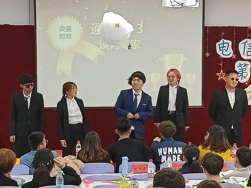 本次大赛共分为两轮,第一轮的参赛作品由经历过初赛层层选拔的八支队伍分别进行呈现。其中相声《于文王》爆笑不断,小品《偶像团》更是嗨翻全场。随着何晶《梦回还》的歌声,一轮比赛宣布结束。其中四支队伍成功晋级,他们分别是计算19-7班、电子19-1班、通信19-3班、通信19-4班。进入二轮比赛的演员们更是使出浑身解数,为夺冠拼尽了全力。最终小品《谈判专家》凭借每一位演员的精湛演技在众多优秀作品中脱颖而出,一举斩获大赛一等奖。
