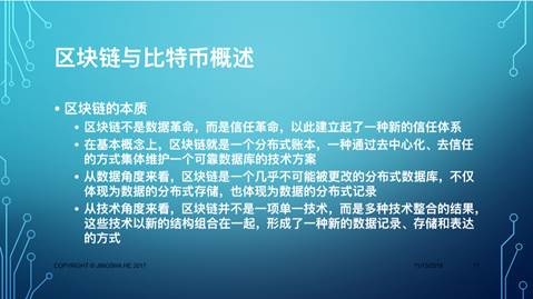报告围绕近两年热点话题区块链与比特币开展,主要包括区块链与比特币的概述、区块链基本原理、核心问题和前景展望四个部分。区块链因其通过分布式数据存储、点对点传输、共识机制、加密算法等技术的集成,可有效解决传统交易模式中数据在系统内流转过程中的造假行为,从而构建可信交易环境,打造可信社会。近年来各国政府机构,国际货币基金组织以及标准、开源组织和产业联盟等在纷纷投入区块链产业的拉通和应用。随着区块链的产业价值的逐渐确定,区块链迅速地成为一场全球参与竞逐的“军备”大赛,中国也开始从国家层面设计区块链的发展道路(发改委委托信通院组织国内主要区块链公司进行区块链的顶层设计的研讨,工信部的信软司也在积极确定区块链的顶层设计机构)。2018年,区块链及相关行业加速发展,中国将领跑全球进入“区块链可信数字经济社会”,我们正面临区块链重大的产业机遇。