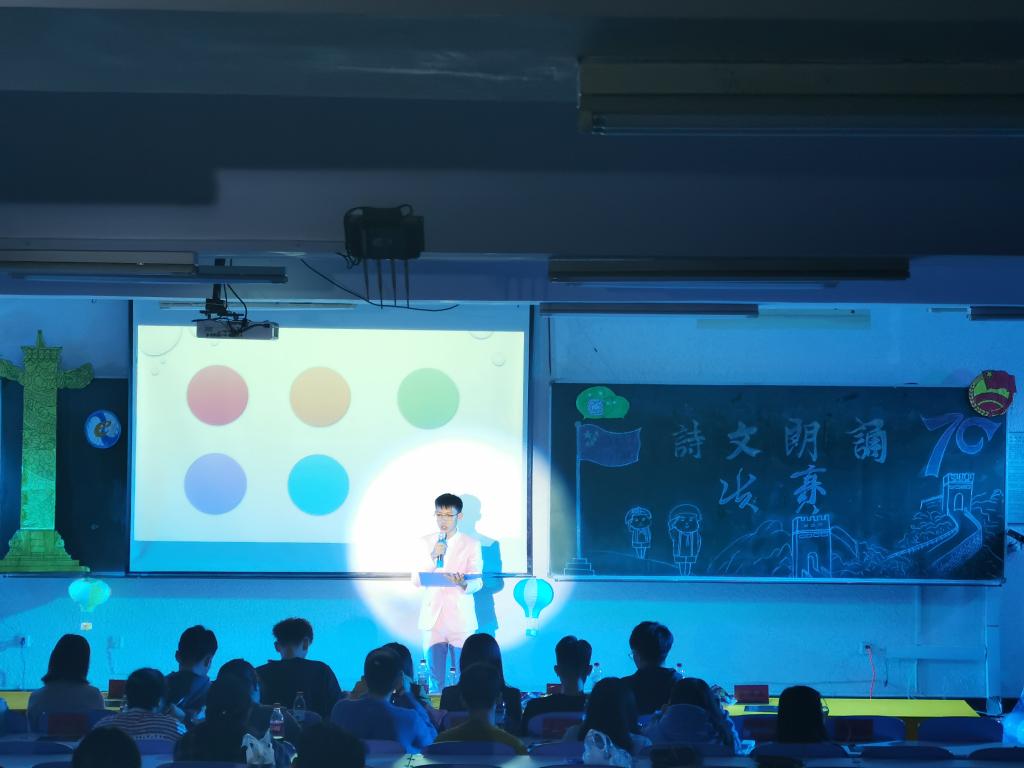 于静远楼419举行诗文朗诵大赛。适逢祖国70华诞,本次活动旨在践行社会主义核心价值观,弘扬爱国主义精神,培养大学生的家国情怀,推动校园文化建设。