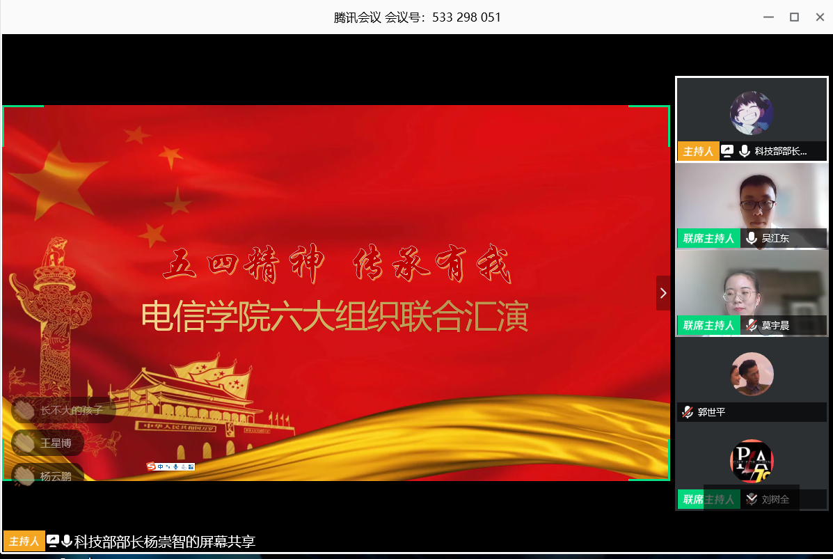 于腾讯会议直播平台举办了线上“五四精神,传承有我”主题汇演。此次汇演由3377体育