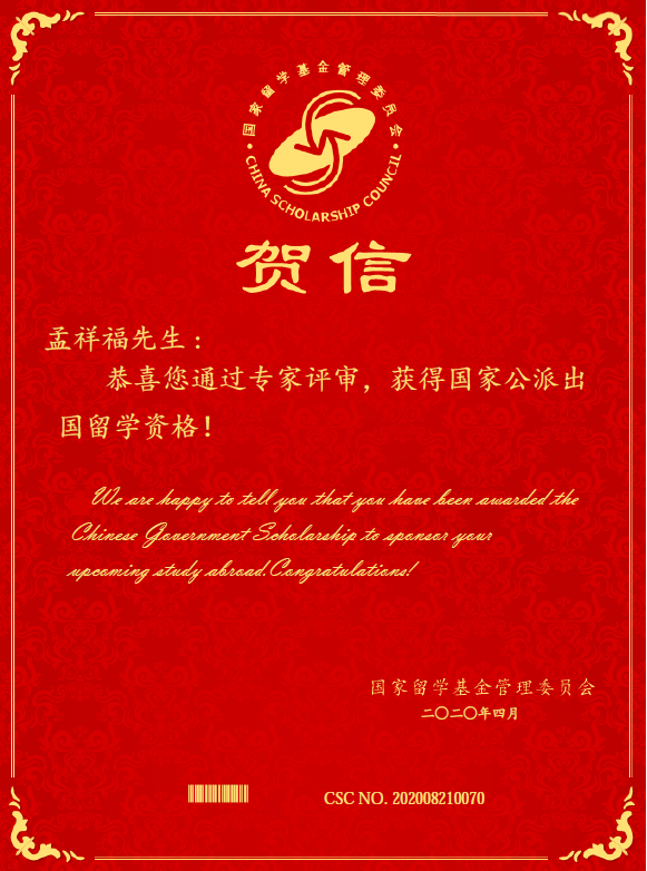 孟祥福教授成功获批,由国家留学基金委全额资助,以访问学者身份赴美国开展为期1年的研修工作。