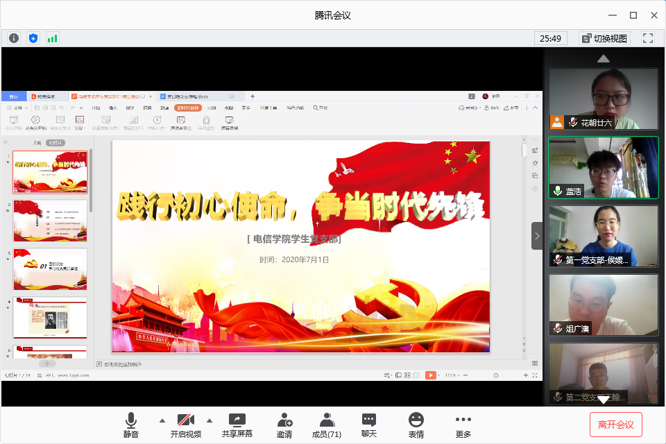 为庆祝中国共产党成立99周年,缅怀党的光辉历程,讴歌建党、新中国成立以来取得的伟大成就,激发学生党员爱党爱国爱校的热情,为党和国家社会主义事业发展助力,学生党支部开展了“践行初心使命,争当时代先锋”云党日活动,暨毕业生党员云送别会。