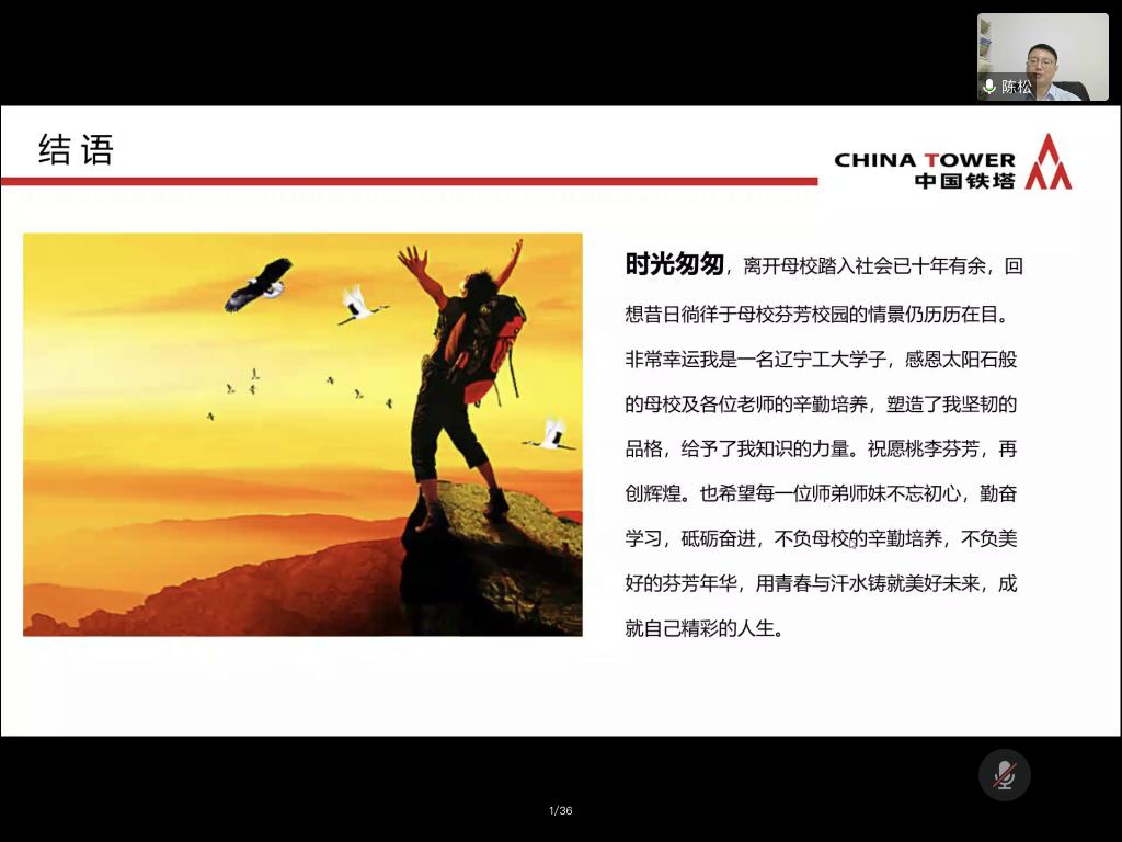 报告最后,主讲人陈松表达了对母校的感激之情,他说时光匆匆,离开母校踏入社会已十年有余,回想昔日徜徉于母校芬芳校园的情景仍历历在目。非常幸运作为一名辽宁工大学子,感恩太阳石般的母校及各位老师的辛勤培养,塑造了其坚韧的品格,给予了其知识的力量。祝愿桃李芬芳,再创辉煌。也希望每一位师弟师妹不忘初心,勤奋学习,砥砺奋进,不负母校的辛勤培养,不负美好的芬芳年华,用青春与汗水铸就美好未来,成就自己精彩的人生!