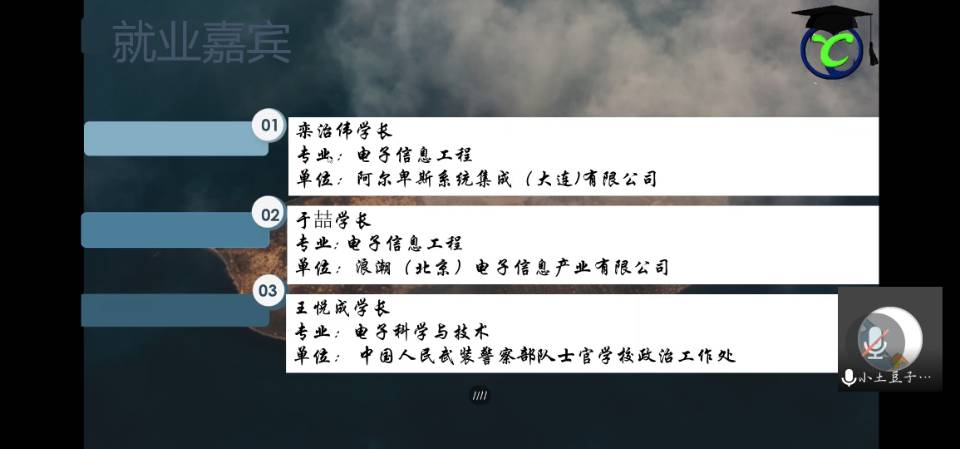 于线上开展了“未雨绸缪,考研交流”主题会议和“牵就业之手,向未来出发”主题会议。本次会议邀请的嘉宾有李二鹏、倪俊锋、蓝浩、顾梦雨、于喆等共11位优秀考研、就业代表。