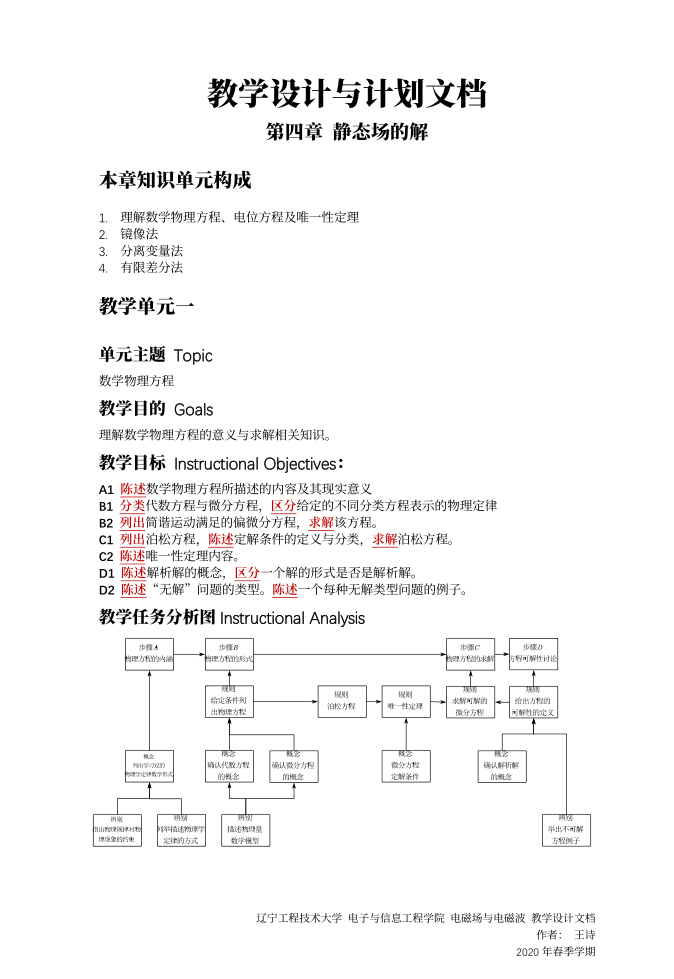(1)理论教学设计的标准化对于教学设计规范,王诗博士经过多年的教学方法理论研究和实践,设计了一套《教学设计文档编写说明》,主要包括教学单元选取与设计原则、教学目的定义与设置、教学目标定义与设置、教学任务分析图、教学事件设计和形成性评价等6个部分;并且结合《电磁场与电磁波》课程,给出了具体的教学设计与计划文档。该文档规范首先按照课程目标、教学内容之间的相关性以及OBE理念要求,分解和提取课程内容教学单元,每个教学单元对应一个逻辑上相对完整的教学内容和学生某项能力的培养要求,教师按照教学单元各要素的要求编制教学设计文档。图1、图2给出了教学设计文档编写说明和教学设计文档实例。
