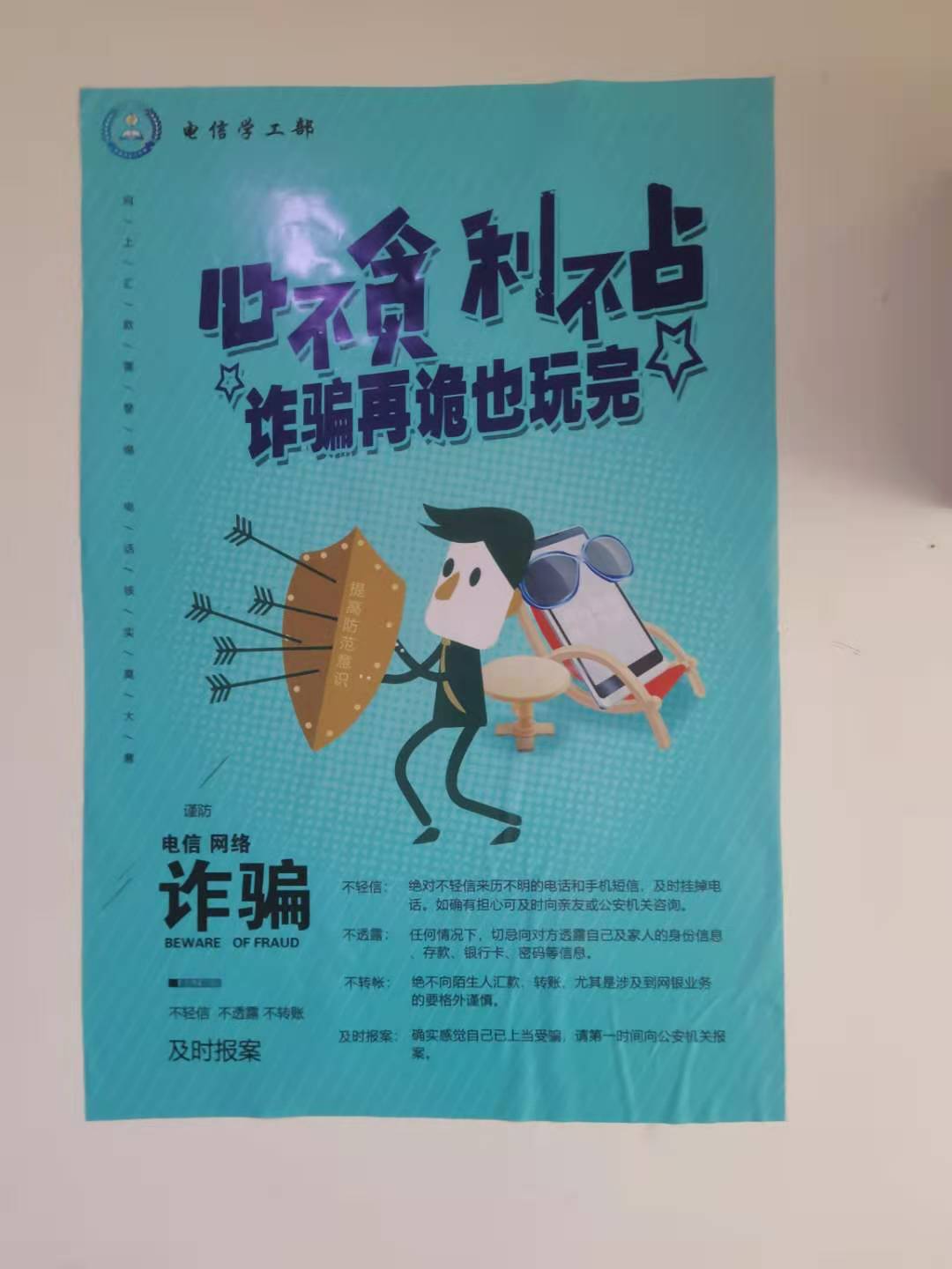 通过召开主题班会、安全教育知识宣传、对校园贷、网络诈骗等信息进行摸底排查,提高同学们的防范意识,引导同学们树立正确的消费观念。组织观看线上防诈骗讲座,提高同学们防诈骗意识,擦亮眼睛、认清骗局。同时张贴安全类海报、横幅,营造校区良好的安全氛围,时刻提醒大学生增强防范意识,保障人身财产安全。