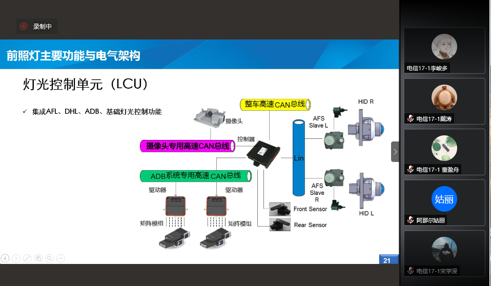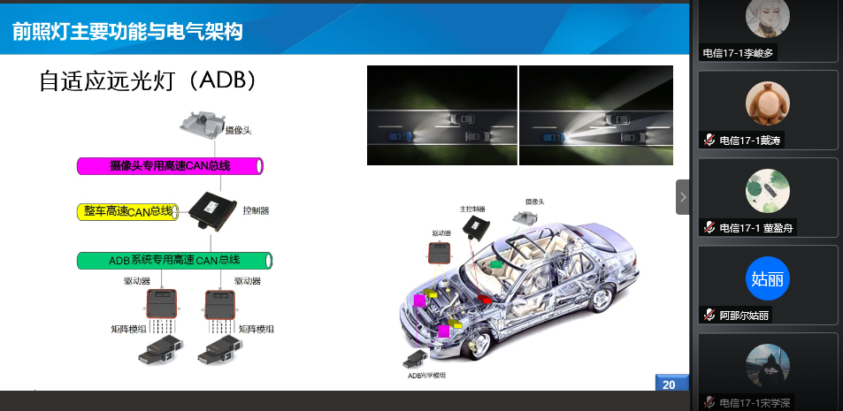 徐楠校友讲解了嵌入式在车领域的应用。嵌入式应用于轿车、卡车等各种车型中,应用方面例如车辆的示廓灯、前照灯和内饰灯等,此外还讲解了前照灯的发展历程和未来前景,从煤油灯、乙炔灯、氙气灯到LED,再到未来将普及的像素大灯。