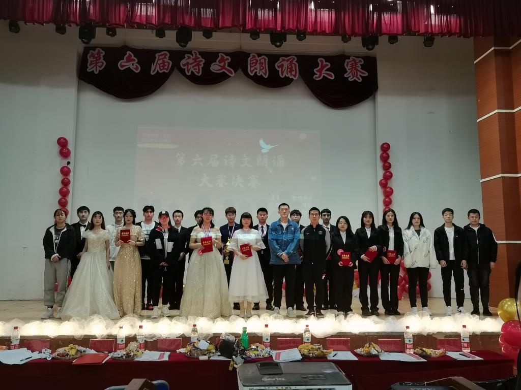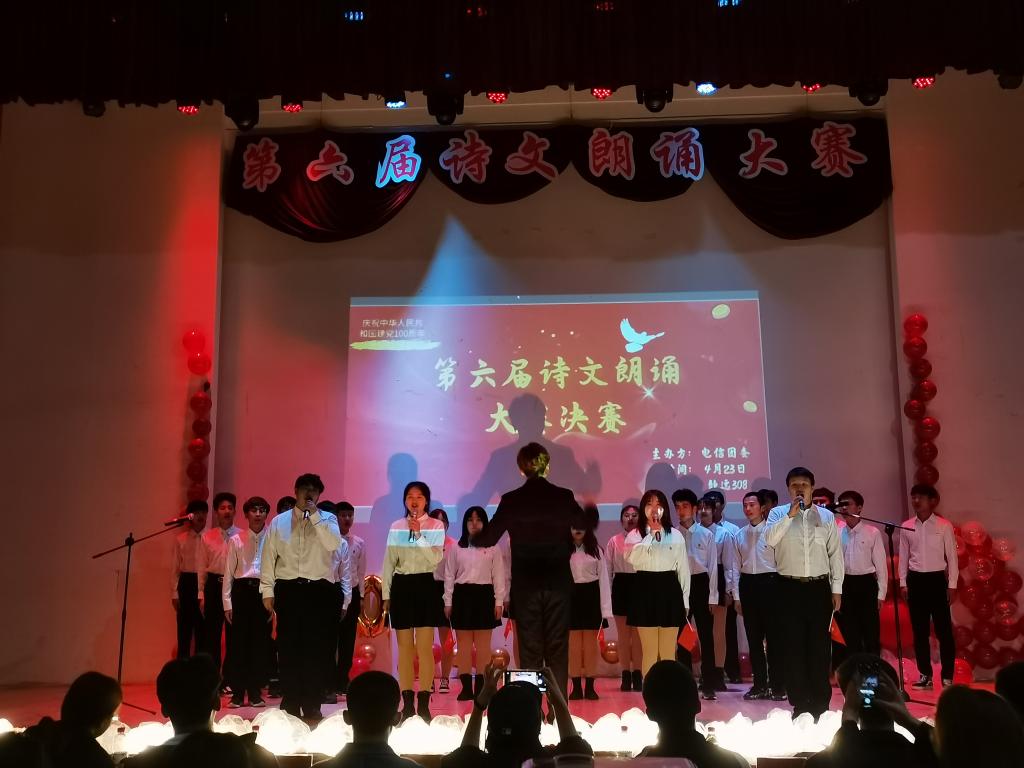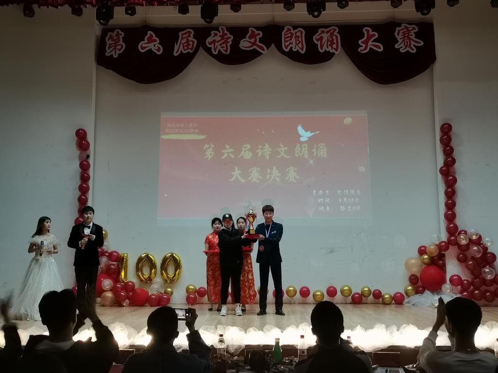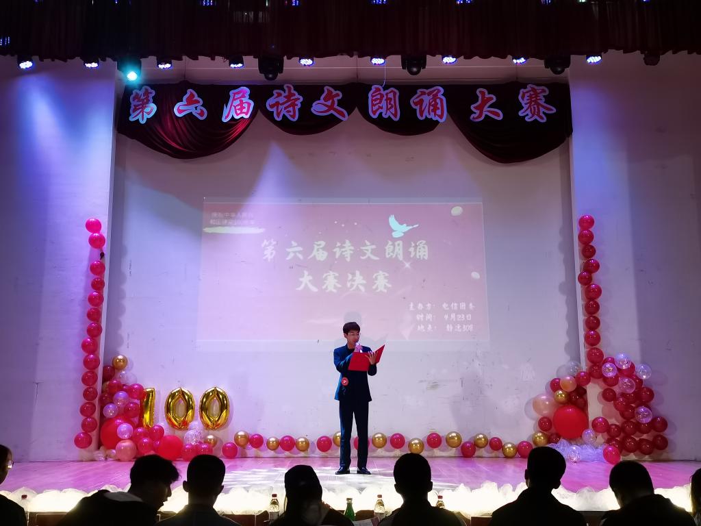 朗诵经典诗篇,品味中华美文。近六十位同学登上舞台,带我们领略中华诗篇,向我们展示中华文人的文采。经过初赛的筛选,12位选手进入决赛。决赛共分两轮,第一轮形式为自选稿件朗诵,评委根据朗诵情况评分,得分最高的6位选手进入第二轮;第二轮为随机抽取稿件朗诵,参赛选手以饱满的激情、激昂的语言、大方得体的举止来展现自己的实力,把对党和国家的感情表达的淋漓尽致。最终,计算20-4班的王得霖同学凭借浑厚磁性的嗓音,感染了现场的所有同学,也赢得评委的一致好评,摘下本次比赛一等奖的桂冠。