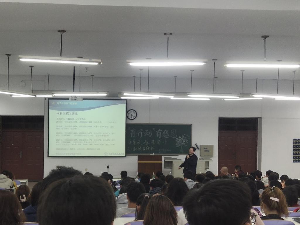 和自身发展而奋斗”。针对通信、电信、电子三个专业的新生,南敬昌院长热情洋溢的向同学们进行了自我介绍,随后以“家国情怀,爱院荣校”切入报告主题,围绕3377体育