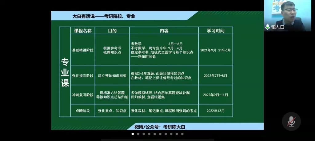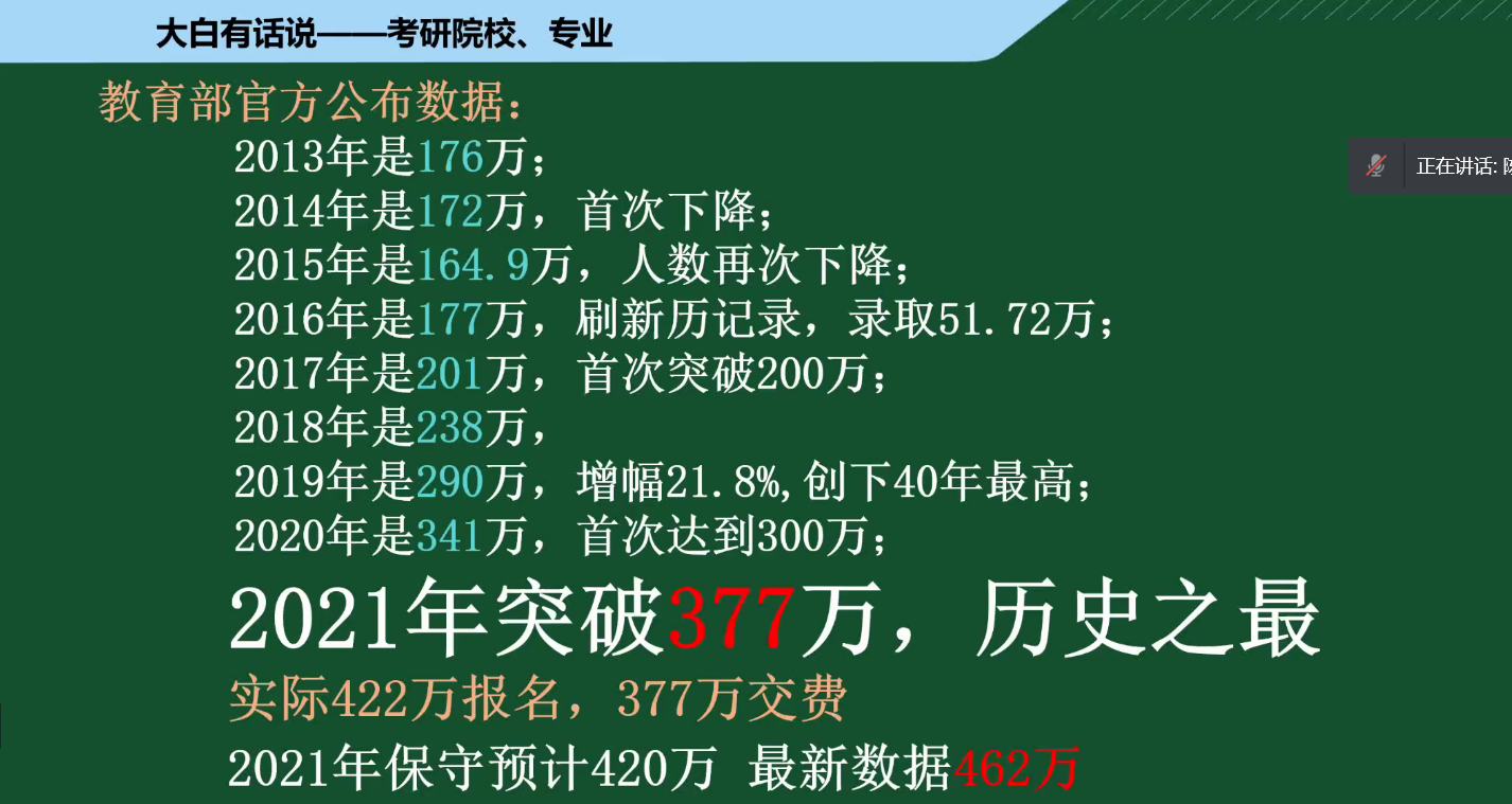 本次大会分为两部分:老师讲解和提问环节。陈老师先进行了简单的自我介绍,随后围绕着“考研形势、热门专业、考研常识、考试内容、全年备考流程与复习计划、专业院校选择思维逻辑”等六个部分做了考研动员报告。同时,陈老师结合3377体育