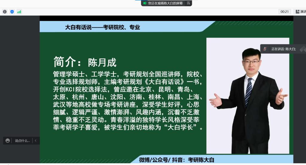 举办线上考研动员大会,会议邀请具有多年考研教育经验的陈月成老师担任主讲人,为2019级具有考研意愿的同学们指明方向,坚定考研信念。
