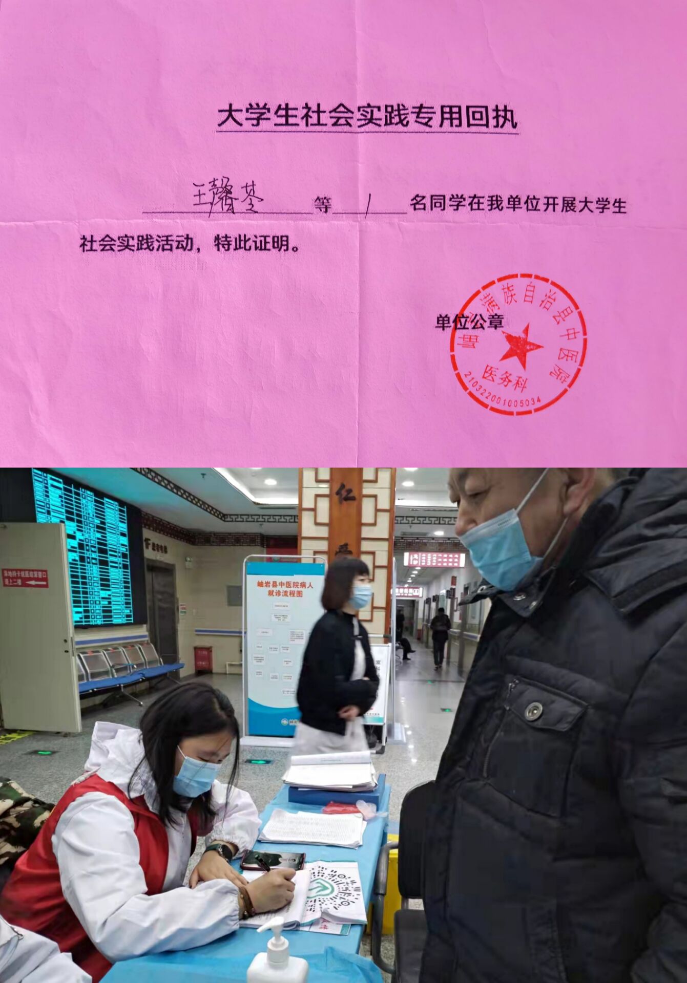 计算机科学与技术专业2021级本科生,为了响应辽宁省鞍山市的防疫政策,身为大学生的王馨苓报名参加志愿服务。王馨苓的志愿任务主要是在医院门口扫码登记。在做好自身安全防控的情况下,提醒群众佩戴口罩,对所有进出人员进行体温测量、信息登记,发现体温异常者及时协助医院采取隔离措施,为家乡防疫工作贡献自己的一份力量。通过这次志愿活动,王馨苓体会到了为人民服务后的幸福感,也找到了自己在志愿服务中的价值。王馨苓说到她会在人生的漫长旅途中不断地为社会做贡献,传递爱心,把志愿服务当做情怀,用实际行动助力疫情防控,尽自己所能替社会分担劳苦。