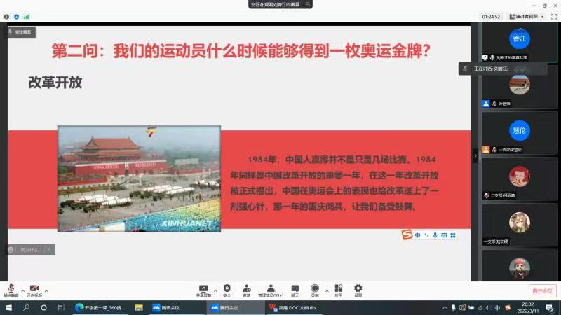 学生党支部于3月11日晚七点以网络会议形式组织全体学生党员开展了以“从奥运征程,看中华崛起之路”为主题的专题理论学习暨“学生党员开学第一课”。