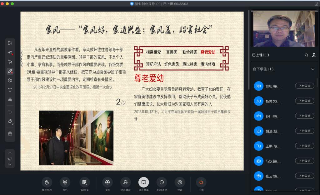张洋老师开展“学习好家训,传承好家风”专题讲座。“家是最小国,国是千万家”,通过讲座教育引导大学生对良好家风家训的传承和发扬,学会做人、懂得感恩。“引导广大学生增强文化自信,重家教、正家风,赋予中华民族家庭美德的时代内涵,在尊老助残、扶危解困、倡导文明、维护秩序、环境保护等方面不断扩大良好家风文化对学生的影响力和辐射性。