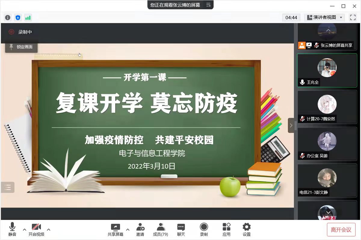 马颖哲、王兆全老师以安全教育为主题,线上开展国家安全、疫情防控、消防安全和交通安全专题讲座。教育引导学生提升安全素养,增强防范意识;以心理健康教育为主题,帮助学生释放情绪、树立健康理念、培育健康心理品格,掌握应对成长、学习、情感、人际关系等方面心理压力的调节方法。在新学期伊始,通过内容丰富的主题班会,树立信心、提振士气、凝聚力量。