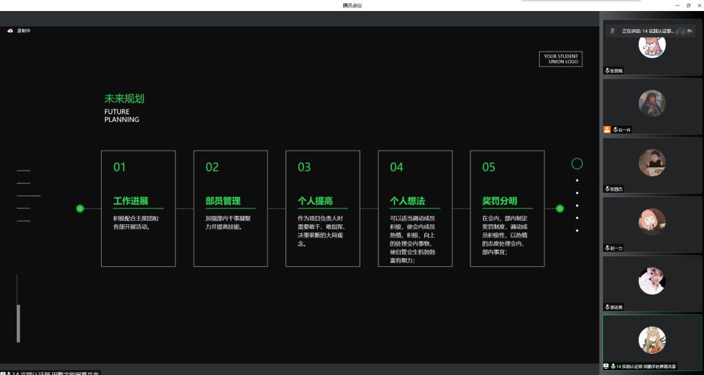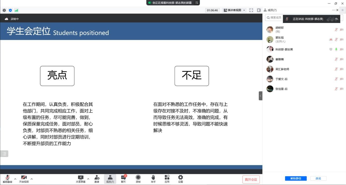 新一届主席团于7月11日下午六点进行了新任部长选举。参加竞选的部员首先进行自我介绍,接着对过去工作进行了总结,并且找出自己工作中的亮点以及不足之处,最后公布如果竞选成功后未来一年的规划。新一届部长名单如下: