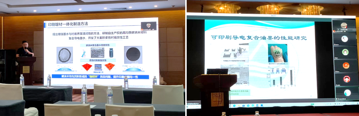 莫黎昕副教授、孙志成教授、辛智青副教授分别介绍了团队在基于PEDOT界面共性印刷的压力-温度双模态柔性传感器方面、柔性交流电致发光显示器件的印刷应用方面、和纸基电子器件方面的研究工作。