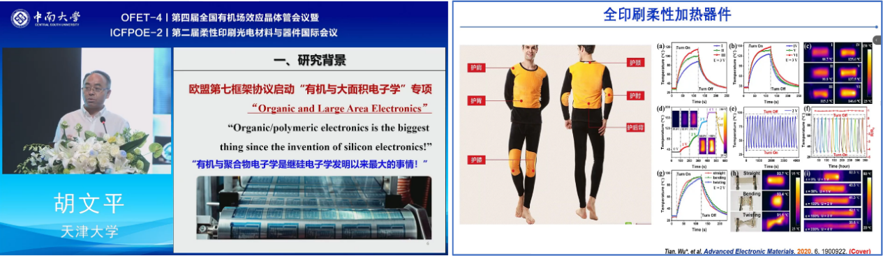 刘云圻院士、马於光院士、东京大学Takao Someya教授、天津大学胡文平教授和华南理工大学彭俊彪教授5位专家先后作了精彩大会特邀报告。其中胡文平教授从关键材料、关键技术和关键应用三个方面展开叙述了有机集成电路面临的挑战,并指出柔性、可印刷、可拉伸的新型电路将成为与硅基电路互补的集成电路的发展新路径,是国家重大战略要求之一。