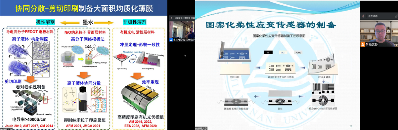 院士李永舫、中国工程院院士赵连城和江苏师范大学副校长董晓臣(代黄维院士)分别进行了特邀主题报告。国家杰青、教育部“长江学者”特聘教授胡文平针对有机集成电路进行了研究报告。南京邮电大学教授、教育部青年长江学者赖文勇,中科院微电子研究所、中组部国家级高层次引进人才李蒙蒙,东南大学教授管英士分别介绍了团队在柔性印刷电子材料与器件、单分子层聚合物场效应晶体管及集成电路,和柔性可拉伸有机半导体材料方面的最新研究进展。中科院百人计划、中科院化学研究所研究员乔雅丽、国家纳米科学中心研究员江潮、吉林大学教授(长白慧谷人才)段羽等也进行了精彩绝伦的报告。针对导电材料的墨水化和图案化难题,3377体育app官方版