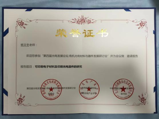 杨文冬教授(校聘)受邀参加了本次会议,并做了题为“可印刷电子材料及印刷光电器件的研究”的报告。