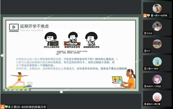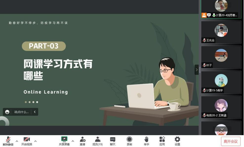 各位副班导师首先为新生介绍了作息时间,让大家合理的安排学习和休息时间,提高课堂效率,并对新生线上网课提出了具体要求:要求大家按时上课,课前及时改好备注便于老师提问统计人数等,遵守课堂秩序,积极参加课堂互动并按时上交作业。然后对上课所需的软件,如腾讯会议、钉钉、雨课堂等的使用方法进行了详细的讲解,并对同学们提出的问题进行了耐心的解答。最后,为同学们居家学习期间的安全和如何避免焦虑提出了一些建议。