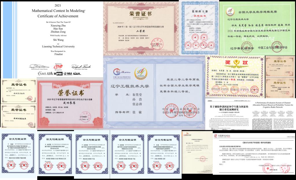 作为队长,她带领团队在数学建模比赛中一次次斩获佳绩。获得了2021年美国大学生数学建模竞赛特等奖提名(F奖),此奖项为我校参与这一国际赛事以来所获得最高奖项;2020年全国大学生数学建模竞赛,全国二等奖;2020年全国大学生数学建模竞赛辽宁赛区,辽宁省一等奖;2021年全国大学生数学建模竞赛,辽宁省二等奖。不仅如此,她也积极参与考验其他专业技能的科技竞赛,如辽宁省大学生智慧海洋科技创新大赛、蓝桥杯、“大唐杯“移动通信5G大赛、辽宁省大学生电子设计竞赛等,并在上述比赛中皆获得省奖。