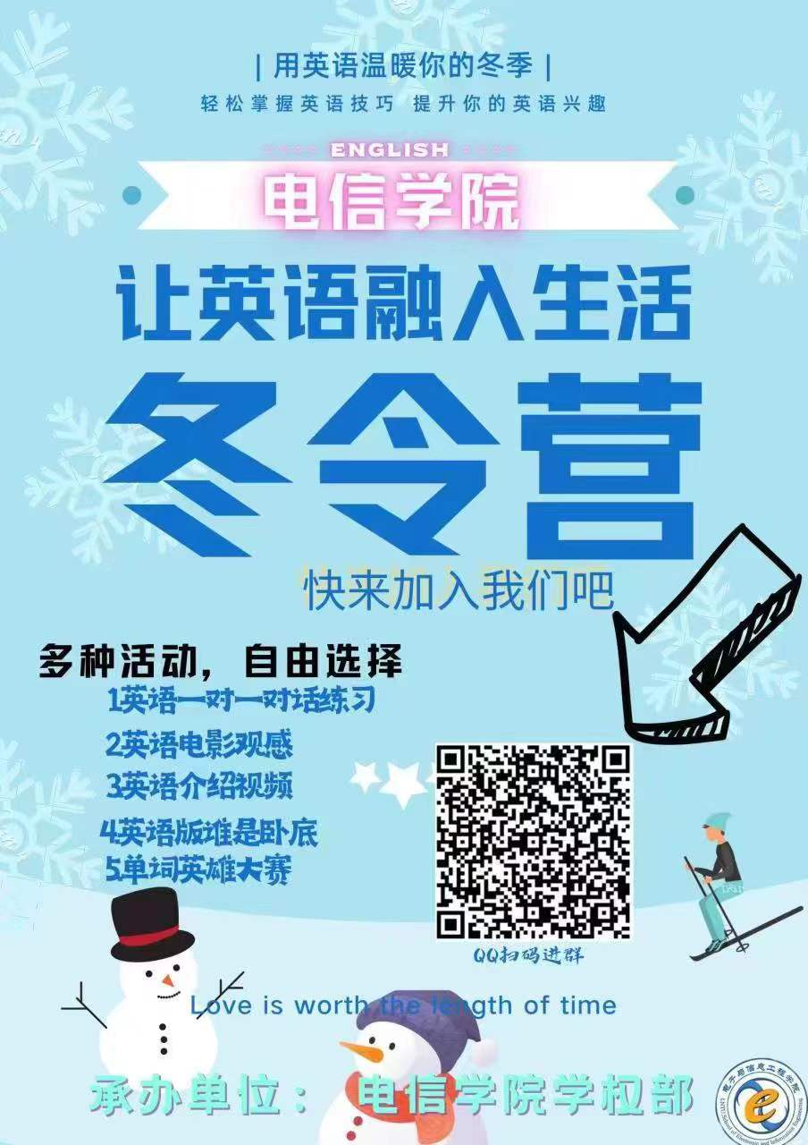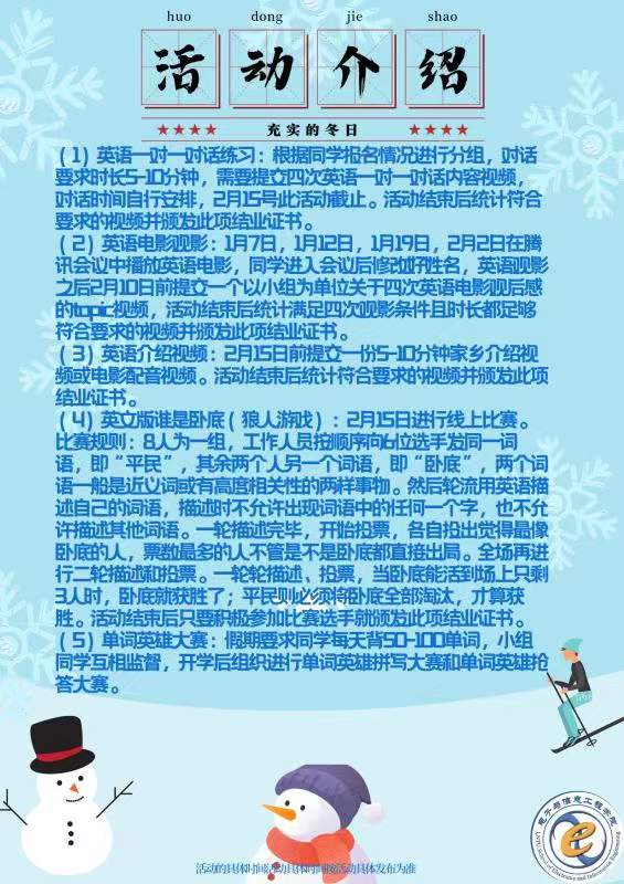 学生会学权部承办的英语冬令营正式开始招生。全力打造完全浸泡式的英语环境,从生活到学习,从活动到课程,全英文交际!