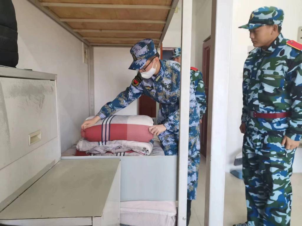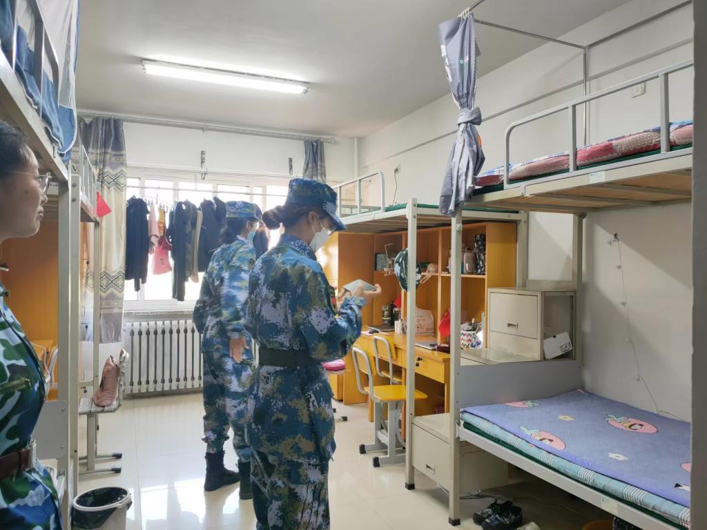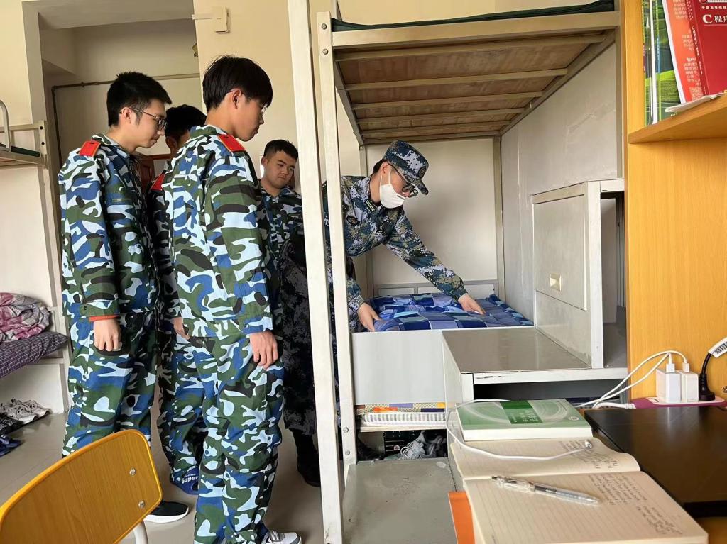 教官分别从寝室卫生、物品摆放、被褥整理等方面对新生寝室进行检查指导,向同学们指出不足之处并提出改进建议。教官们为同学们演示了叠好军被的几个步骤,一边示范一边讲解要领。一床蓬松的棉被在“叠、压、捋”几个动作之下,变成了四四方方的“豆腐块”