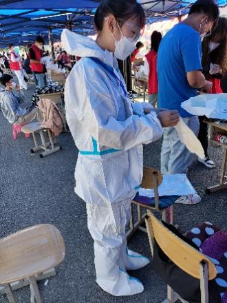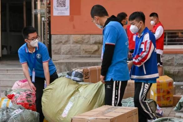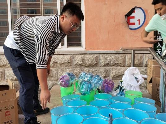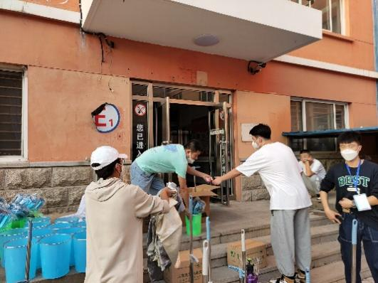 志愿者们正在宿舍楼下准备食品