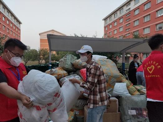 志愿者们正在宿舍楼下对学生的行李进行细致的分拣