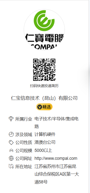仁宝信息技术(昆山)有限公司线上招聘 | 专科及以上学历
