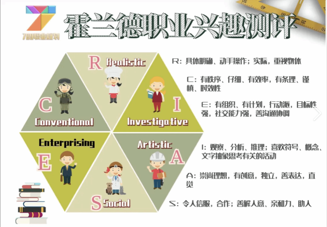 霍兰德职业测评:根据霍兰德职业兴趣理论,认为人的人格类型、兴趣与职业密切相关,人格可以分为现实型、研究型、艺术型、社会型、企业型、常规型六种类型。