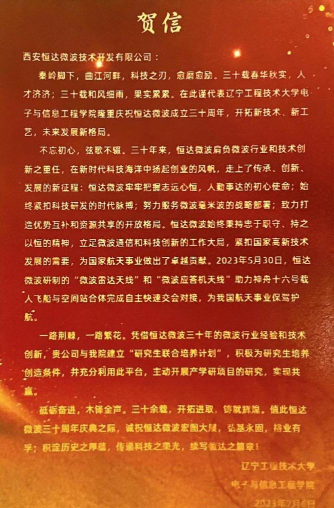 以“技术先进、实业报国”为使命的西安恒达微波技术开发有限公司成立30周年庆典在西安惠宾苑宾馆隆重举行。辽宁工程技术大学电子信息与工程3377体育