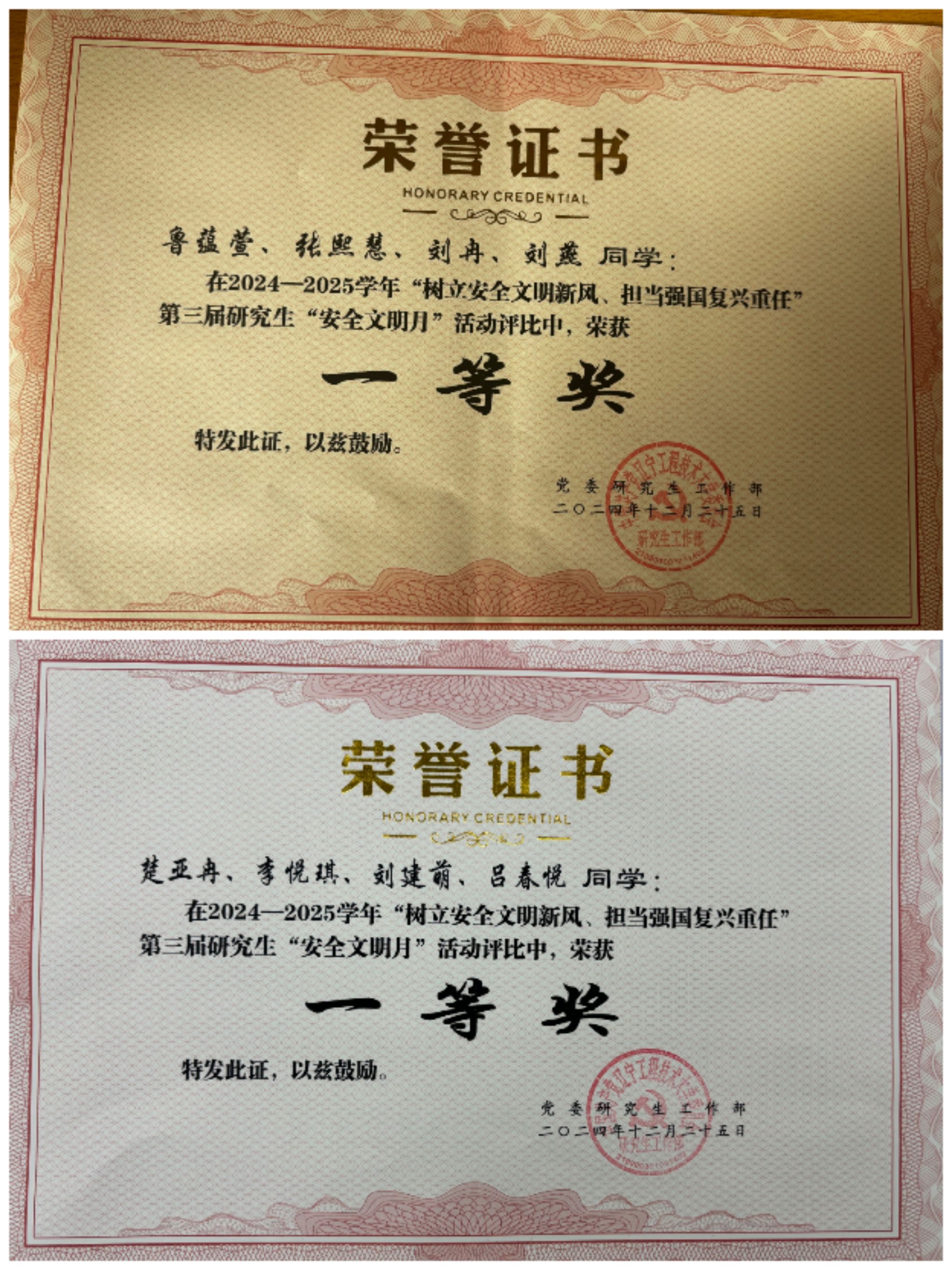 有F1-203、F1-212两个研究生寝室凭借在安全管理、文明行为、学习氛围等方面的卓越表现,荣获本次活动的一等奖,共有八位研究生获得表彰。